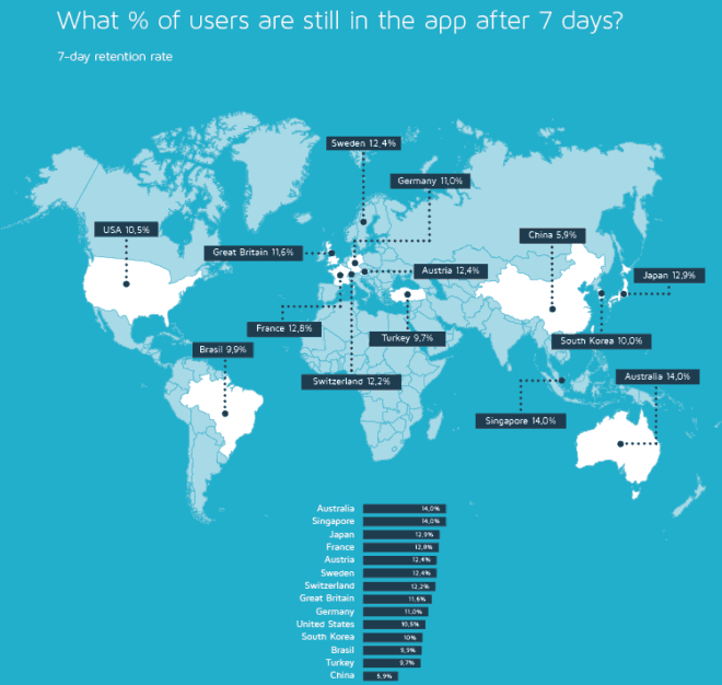 D’après l’étude réalisée par adjust, les utilisateurs de smartphones français ouvrent une app moins de deux fois par jour (1,89 fois) deux semaines après son téléchargement, pour une durée d’utilisation moyenne d’une minute et 50 secondes (1m50s). Les français passent en moyenne 30 secondes de plus à naviguer sur une app que la moyenne mondiale, qui est d’une minute et 21 secondes (1m21s). Par ailleurs, le taux de rétention – fréquence d’usage des individus ayant installé l’app il y a plus de deux semaines – avoisine seulement les 10% (9,675%).