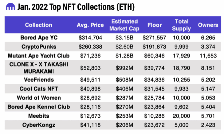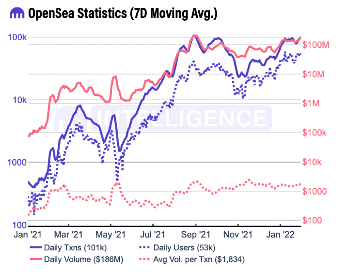 L’activité dans les NFT s’est accélérée en janvier malgré la vente sur le marché plus large de la crypto. La moyenne sur 7 jours des transactions quotidiennes, des utilisateurs et du volume sur OpenSea pour l’activité NFT, a atteint un niveau record et a terminé le mois à 101 000 transactions, 53 000 utilisateurs quotidiens et 186 millions de dollars en volume. Walmart a soumis des demandes pour vendre des biens virtuels dans le métavers et créer sa propre crypto, Samsung a lancé des téléviseurs compatibles NFT, China soft a lancé sa plate-forme NFT soutenue par BSN
