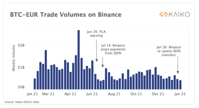 Les transactions Bitcoin exécutées en échange de l’euro ont fortement chuté l’année dernière à la suite d’une répression réglementaire contre Binance. En juillet, la bourse a temporairement interrompu les transferts depuis le réseau de l’espace de paiement unique en euros (SEPA) de l’Union européenne et a interrompu ses offres de produits dérivés en Allemagne, en Italie et aux Pays-Bas. Le volume hebdomadaire moyen BTC-EUR a oscillé autour de 470 millions d’euros le mois dernier, contre 800 millions d’euros en novembre et plus de 1 milliard d’euros au cours des six premiers mois de 2021. La bourse a récemment rouvert les transferts SEPA, bien que cela n’ait pas encore eu d’impact sur opérations libellées en euros. Le récent virage belliciste de la Banque centrale européenne, qui a stimulé une forte hausse des rendements obligataires européens la semaine dernière, pourrait exercer une pression supplémentaire sur la demande de crypto en Europe.