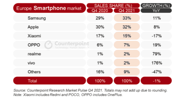 Le marché européen des smartphones gagne 8 % en glissement annuel en 2021. Xiaomi a terminé 2021 avec ses ventes annuelles de smartphones les plus élevées jamais enregistrées en Europe.