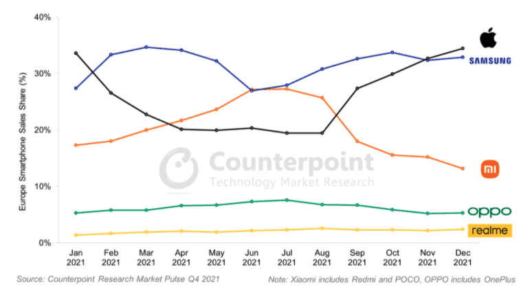 Le leadership de Xiaomi a cependant été de courte durée, car Samsung a repris la tête en juillet 2021 grâce aux fortes ventes de la série A. Samsung a ensuite étendu son avance avec le lancement de ses populaires smartphones pliables Galaxy Z, tandis que Xiaomi a été durement touché par des pénuries de composants. Samsung a continué à dominer le marché au cours des mois suivants, malgré les meilleurs efforts d’Apple, dont le lancement de l’iPhone 13 a trébuché en octobre 2021. Cependant, une fin d’année traditionnellement forte a finalement donné à Apple la tête en novembre 2021, une avance qu’Apple étendu pour atteindre sa part la plus élevée jamais enregistrée en Europe en décembre 2021.