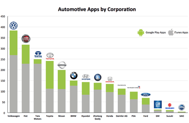 Volkswagen, avec près de 400 applications est l’une des marques qui en à développer le plus, il est presque impossible pour une personne ou un groupe de gérer correctement ce parc ! Bon nombre de questions vont rester sans réponse, en voici quelques-unes : Quels applications vont-être mise en avant ? Quel est le coût d’acquisition des clients? Quelles sont les applications qui sont les plus performantes ? Quels sont les derniers commentaires ? Comment la comparer à mon concurrent ? Où puis-je dépenser mes budgets de marketing pour promouvoir le téléchargement ? Quels sont les pays qui les utilisent ? Bref un travail énorme pour les constructeurs.