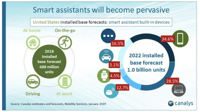 Une grande partie de cette opportunité provient de l’expansion dans des pays non anglophones.À la fin de 2017, les ventes des smart-speaker se limitaient essentiellement aux marchés anglophones, avec plus de 95% des ventes aux États-Unis et au Royaume-Uni. le nombre d’utilisateurs installés dans le monde dépasse les 100 millions d’unités au début de 2019.