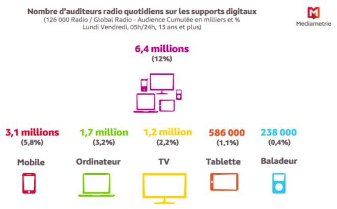 Le téléphone mobile occupe la première place des supports numériques utilisés pour écouter la radio avec plus de 3,1 millions d’adeptes chaque jour. Viennent ensuite l’ordinateur (1,7 million), la télévision (1,2 million), la tablette (586 000) et le baladeur (238 000). L’utilisation des supports digitaux permet de prolonger et de multiplier les occasions d’écouter la radio, notamment en mobilité. Ainsi, le pic d’audience de la radio sur les supports multimédia est plus tardif que sur les postes traditionnels : il se situe à 10 heures (versus 8 heures).