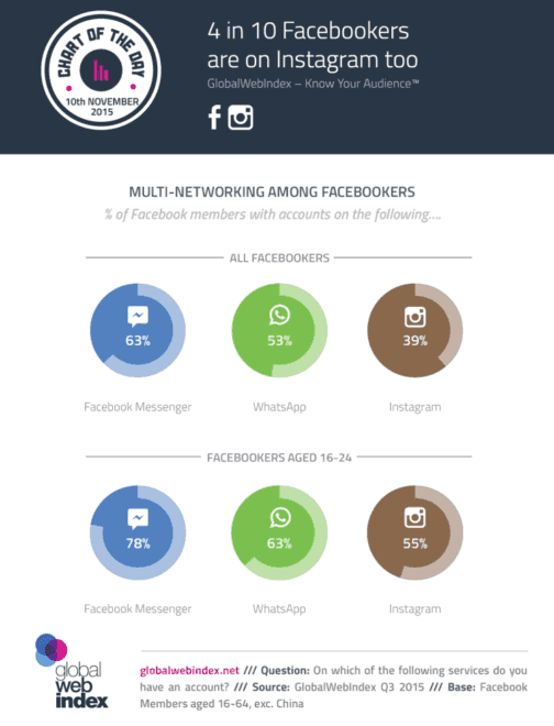 La génération Y est Z, sont les premiers à adopter des usages de ce type et cela tombe à pic, car globalement, plus de 60% des membres de Facebook ont maintenant un compte sur Messenger, ensuite plus de 50% des utilisateurs de Facebook qui sont sur WhatsApp et près de 40% qui sont Instagram, la plupart les 16-25 !!