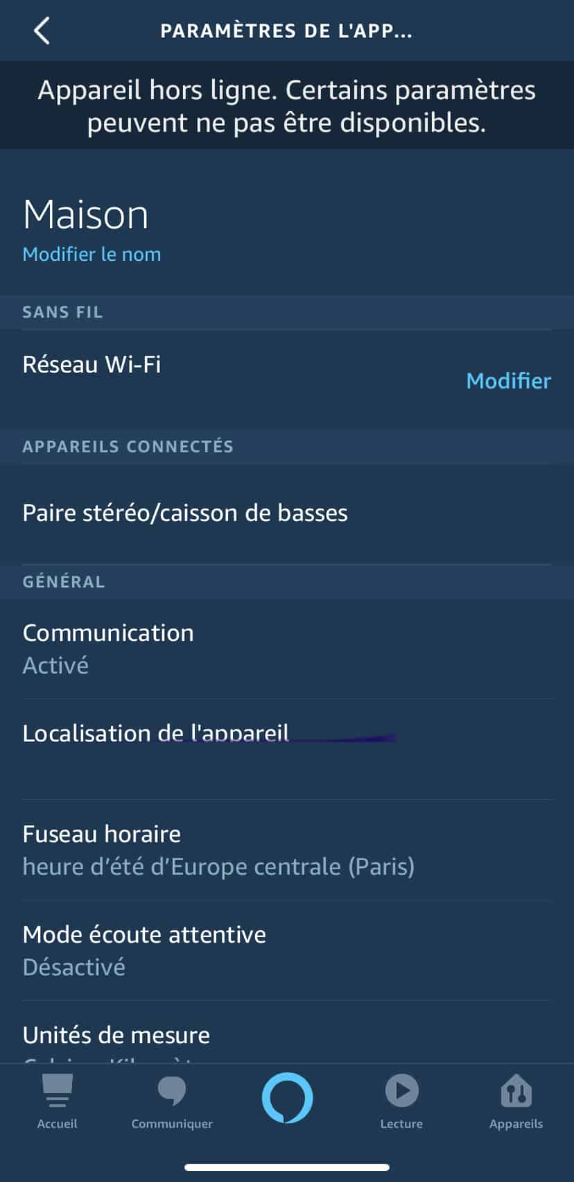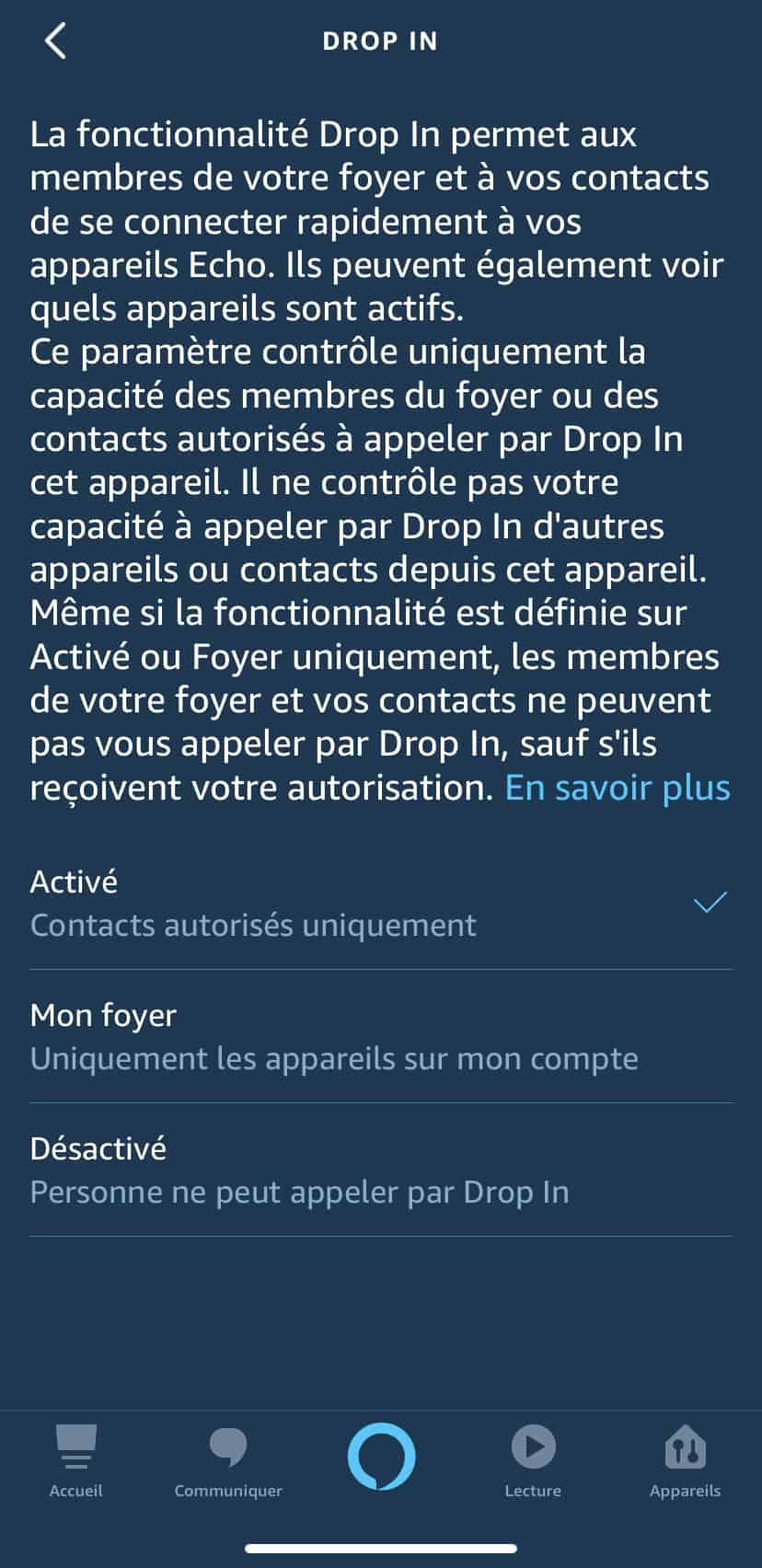 Ouvrez votre application pour smartphone Alexa, appuyez sur Paramètres, puis Paramètres de l’appareil et apparaitra la liste de vos devices, sélectionnez le haut-parleur Echo à modifier. Faites défiler la liste et appuyez sur communication et « Drop In » et à partir de là, vous pouvez le régler sur Activer, Mon foyer, Désactivé