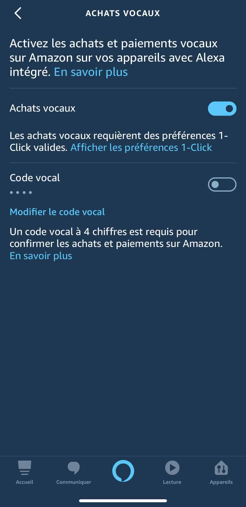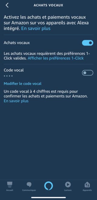 Maintenant, le code à quatre chiffres doit être prononcé pour finaliser un achat sur votre Echo. Vous pouvez aussi lui demander de reconnaitre votre voix, le code vocal ne sera pas requis.