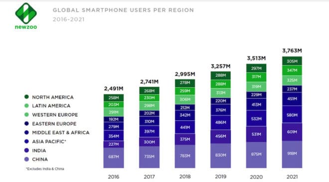 Les utilisateurs de smartphones dépasseront les 3,8 milliards en 2021. À l’échelle mondiale, c’est environ 40% de la population qui utilisent un smartphone. Ce pourcentage devrait atteindre 48% d’ici 2021.