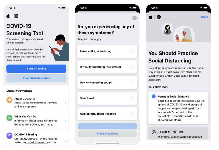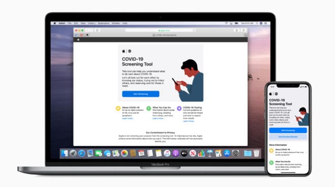 Apple a lancé une nouvelle application de dépistage et site Web Covid-19 (coronavirus), pour aider les utilisateurs américains à déterminer s’ils doivent subir un test de dépistage de la maladie et les diriger vers des informations supplémentaires provenant de sources médicales fiables.