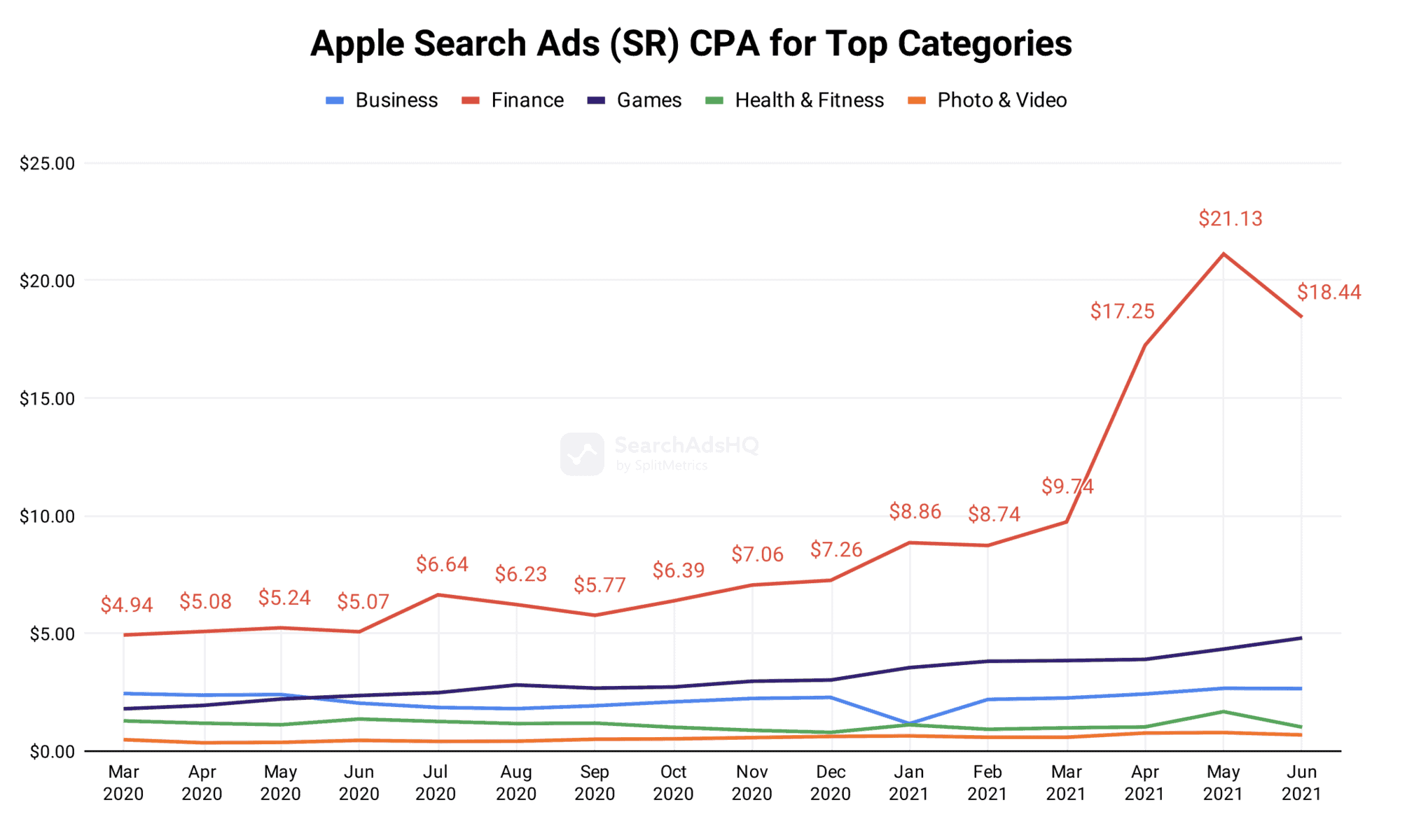 Selon le rapport d’analyse comparative des annonces Apple Search sur T1-T2 2021, la tendance mondiale est aux applications de finance, de crypto-monnaie et de trading, en particulier. Le marché des crypto-monnaies vient de franchir les 2 000 milliards de dollars, nous pouvons donc nous attendre à ce que cette tendance se poursuive. La concurrence entre les applications de crypto sur l’App Store deviendra plus rude, elles diffuseront des annonces Apple Search et le CPA continuera de croître, affectant cette mesure pour l’ensemble de la catégorie Finance.