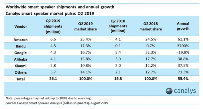 Baidu remplace Google pour devenir le numéro deux du marché des enceintes intelligentes au deuxième trimestre 2019 ! Le marché mondial des haut-parleurs intelligents a augmenté de 55,4% au deuxième trimestre 2019 pour atteindre 26,1 millions d’unités. Amazon a maintenu sa position de leader mondial en livrant 6,6 millions d’unités de haut-parleurs intelligents Echo.
