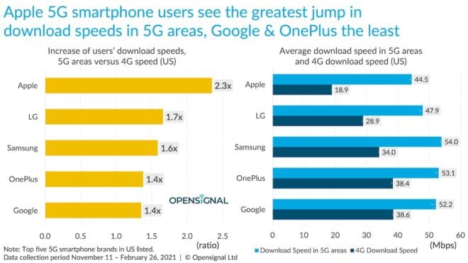 Les utilisateurs d’Apple voient le plus grand bond en termes de vitesse dans les domaines 5G parmi les marques de smartphones, 2.3 fois plus rapide.
