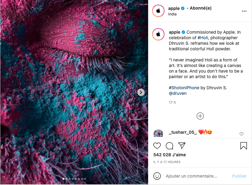 Apple a publié une série d’images sur son compte Instagram pour marquer le festival hindou de Holi, demandant au photographe Dhruvin S. de prendre des images mettant en vedette la poudre de couleur signature du festival à l’aide de l’iPhone. Ce n’est pas la première fois qu’Apple utilise le festival pour présenter les capacités de la caméra de ses appareils. En 2018, la société a partagé des images de personnes couvertes de poussière, toutes prises sur des iPhone.
