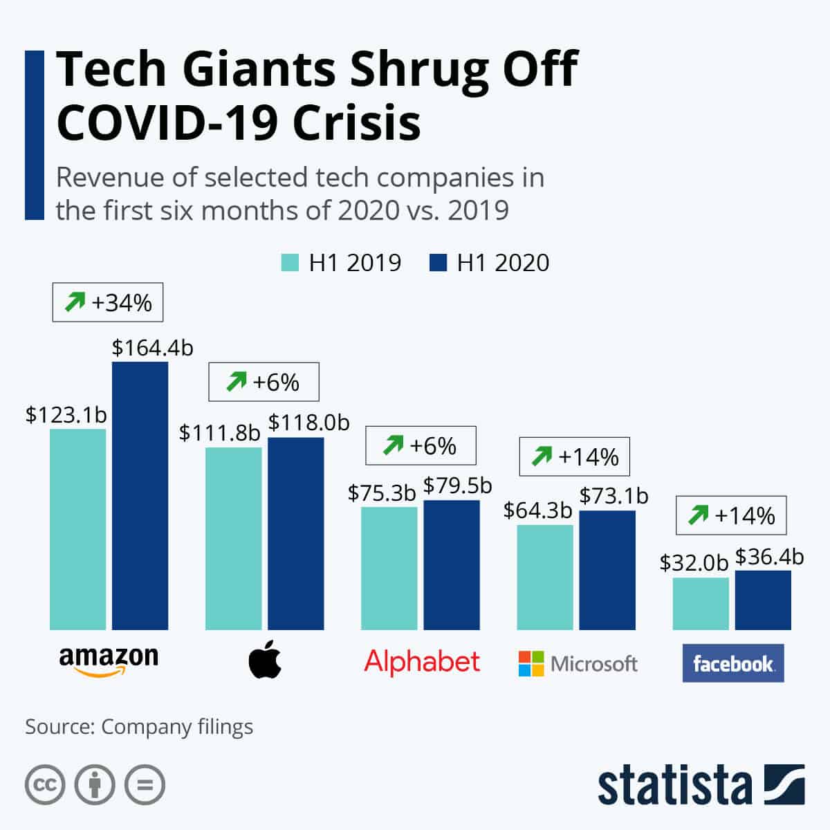 Comme le montre le graphique suivant, Amazon a augmenté ses revenus de plus de 30% d’une année sur l’autre au cours des six premiers mois de 2020, avec un bénéfice trimestriel record au deuxième trimestre comme cerise sur le gâteau. Alors que le succès d’Amazon pendant la pandémie semble logique, étant donné que de nombreuses personnes sont passées aux achats en ligne pendant le verrouillage, l’immunité relative contre la crise démontrée par Apple, Google et Facebook est davantage une surprise. Après tout, ces deux derniers dépendent fortement des dépenses publicitaires, qui ont sensiblement baissé au cours des derniers mois, tandis qu’Apple vend des biens de consommation à prix élevé, une activité qui ne semble pas adaptée aux périodes de chômage de masse et d’incertitude économique.