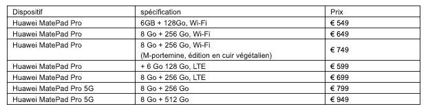 Le HUAWEI MatePad Pro 5G sera disponible à partir Juin 2020 sur certains marchés , y compris la Chine continentale, l’Asie – Pacifique, EMEA et en Amérique latine. Le HUAWEI MatePad Pro sera disponible à partir Avril 2020 sur certains marchés, notamment en Asie – Pacifique, EMEA, la Russie, le Japon, l’Amérique latine.