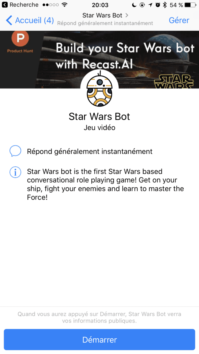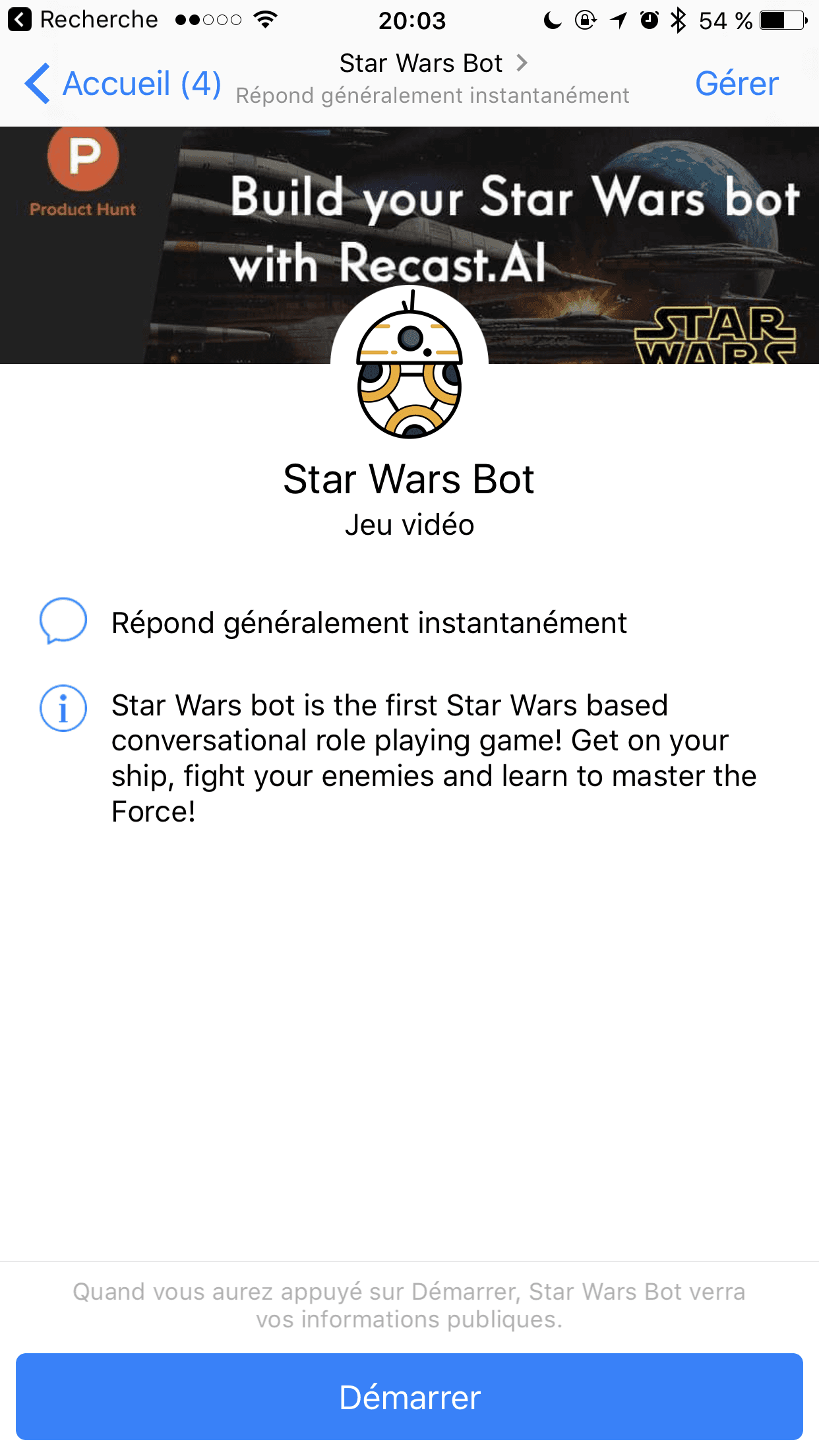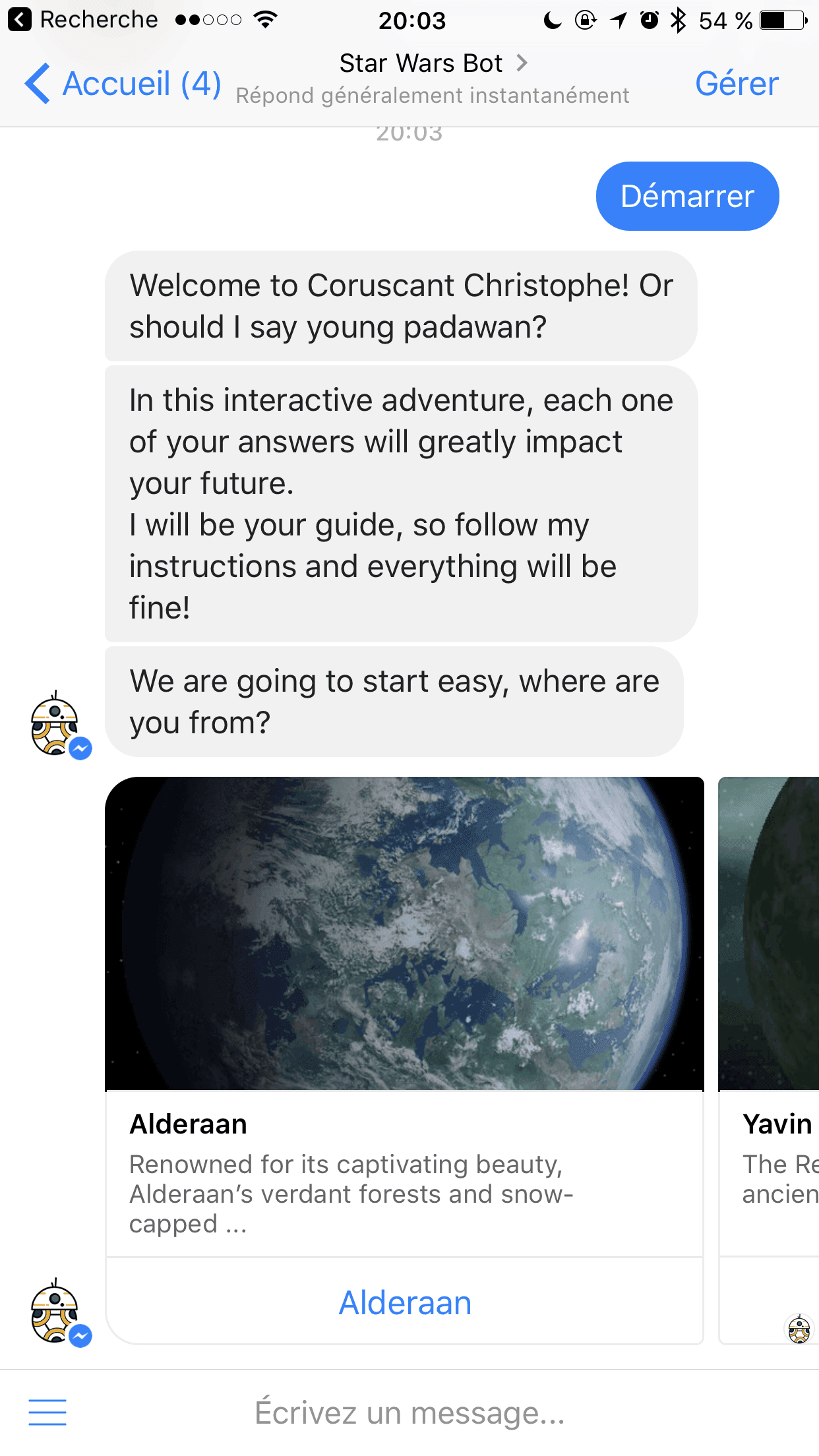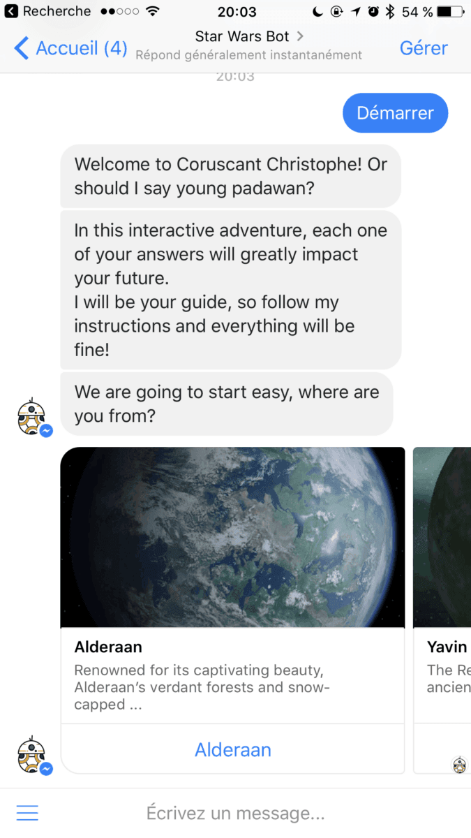 Un nouveau film de Star Wars attire à la fois les fans de longue date et les nouveaux arrivants, et ce bot est parfait pour les deux! Soit pour découvrir une nouvelle façon d’interagir avec votre monde de science-fiction préféré ou pour apprendre de nouveaux faits, Star Wars Bot a été réalisé par Recast.AI