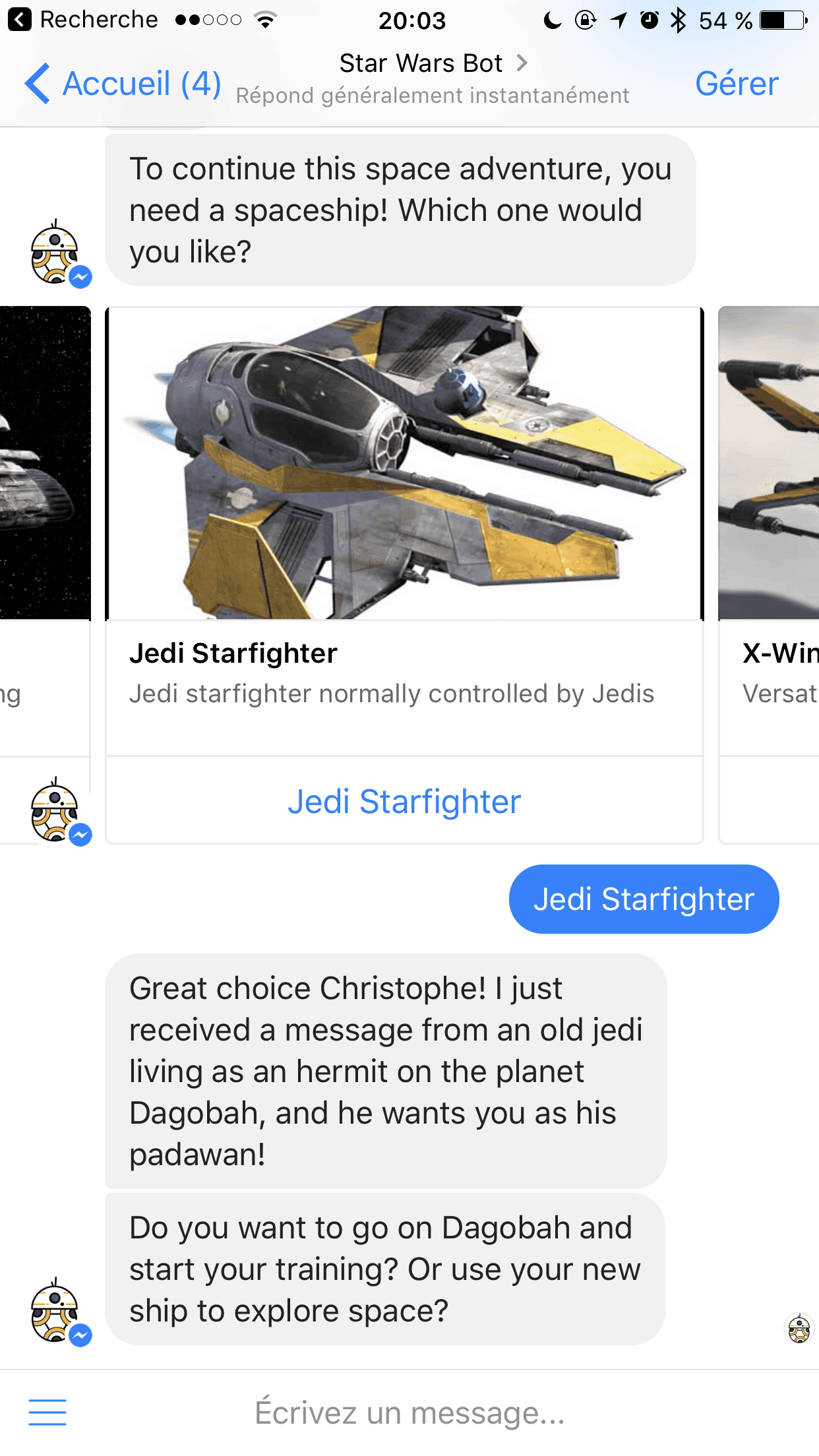 Les utilisateurs peuvent consulter Star Wars Bot sur leur ordinateur portable ou sur le mobile il parle anglais et est disponible sur Messenger (et bientôt Kik)