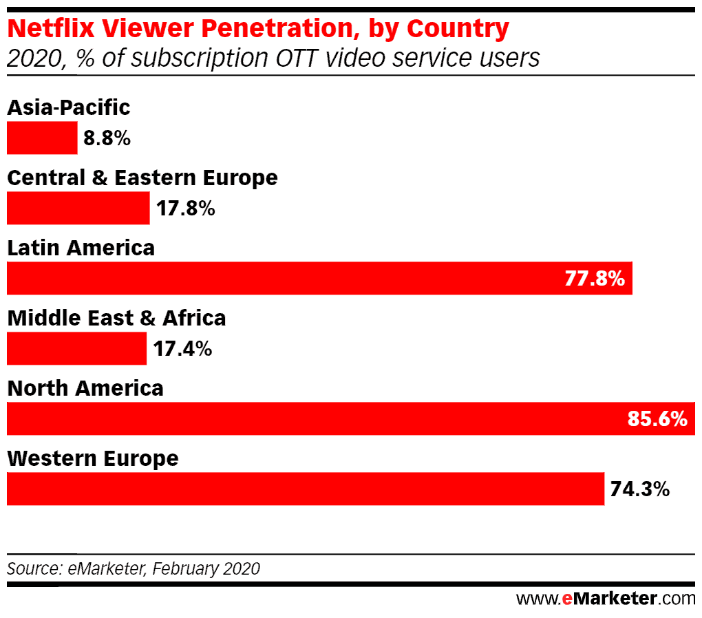 – Alors que l’Amérique du Nord représente 36,6% de tous les téléspectateurs de Netflix, sa part diminue, alors que Netflix se développe à l’international.