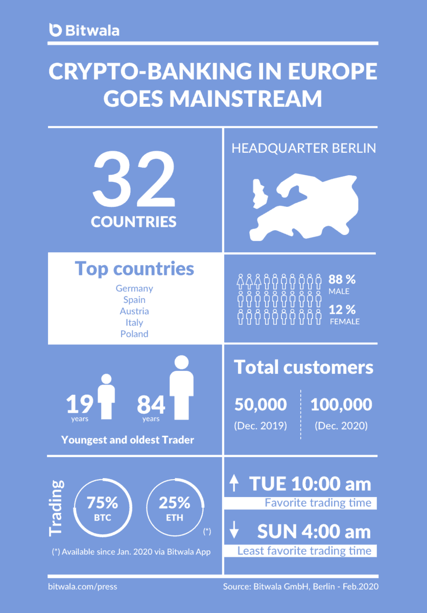 Bitwala offre un service de compte bancaire gratuit avec portefeuilles intégrés crypto-monnaie. Depuis lors, la société basée à Berlin a pénétré le marché européen avec une offre crypto-monnaie. Dans sa première année d’activité, Bitwala de Berlin a acquis +50 000 clients dans 32 pays européens.