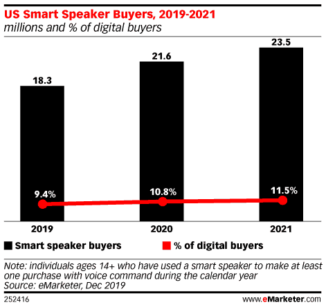 Les achats vocaux progressent plus lentement que prévu ! L’estimation indique que le nombre d’acheteurs d’enceintes intelligentes augmentera d’environ 18% cette année, contre 18,3 millions en 2019, et représentera environ 11% du total des acheteurs numériques. D’ici l’an prochain, le nombre d’acheteurs vocaux devrait atteindre 23,5 millions pour représenter environ 12% du total des consommateurs de commerce électronique, par eMarketer. Source