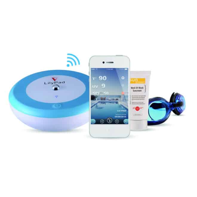 Lilypad, le premier capteur piscine thermomètre et UV Wi-Fi intelligent connecté à votre téléphone. L’utilisation du double capteurs intégrés dans le Lilypad, les utilisateurs peuvent désormais profiter de la température en temps réel et les données UV sur leur appareil. Armés de cette information, les nageurs peuvent immédiatement prendre une décision éclairée quant à savoir si l’eau est assez chaude, ou le soleil est trop fort.