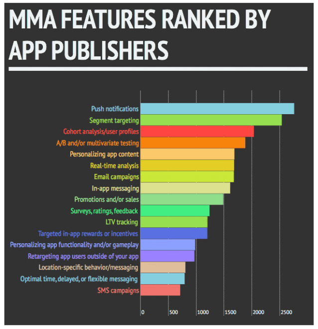 L’automatisation du marketing mobile est une nouvelle discipline qui se manifeste par un ensemble d’outils et de plates-formes SaaS, tout comme l’automatisation du marketing «traditionnel», et il permet aux marketers de faire une série de choses étonnantes qui améliorent l’expérience du client sur l’ensemble des points de contact mobiles (web, les médias sociaux, applications mobiles natives, et même dans le monde réel grâce à la technologie iBeacon) à travers le cycle d’achat de vos clients. Selon l’étude de VB, cependant, seulement environ la moitié des applications qui ont intégré le SDK d’une solution de marketing mobile ont vraiment commencé à appliquer le MMA de manière significative.