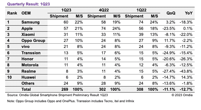 Malgré la forte baisse d’une année sur l’autre, Samsung a toujours enregistré le plus d’expéditions au 1T23, avec 60 millions d’expéditions. Il a connu une légère augmentation de 3,2 % des livraisons par rapport au trimestre précédent, mais ce n’est pas une augmentation suffisante comme elle l’a fait les années précédentes avec sa série annuelle Galaxy S. Son avance sur Apple a diminué par rapport au 1T22, passant de 18 millions de plus qu’Apple en 2022 à seulement 3 millions de plus au 1T23 – en tant que tel, il a également vu sa part de marché chuter de 24 % à 22 %.