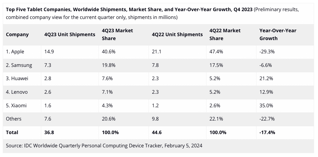 En 2023, le secteur des tablettes a connu une baisse record de 17,4 % au quatrième trimestre, avec seulement 36,8 millions d'unités expédiées, marquant la plus forte baisse depuis 2016. Sur l'année, le déclin a atteint 20,5 % par rapport à 2022, avec un total de 128,5 millions d'unités, le plus faible depuis 2011.