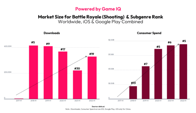 Avec 15 millions de personnes qui se sont préinscrites au jeu, l’appétit des consommateurs pour les jeux Battle Royale/Shooter est l’un des facteurs déterminants. Selon les métriques de data.ai, le genre Battle Royale a connu une croissance explosive depuis 2018, avec des titres importants tels que Fortnite, PUBG Mobile, Free Fire et Knives Out qui stimulent l’adoption. En effet, sur les 153 sous-genres de jeux uniques suivis par Game IQ de data.ai, Battle Royale/Shooting est au 19e rang (au premier semestre 2022). Les téléchargements collectifs s’élèvent à 329 millions (contre 221 millions en 2021) avec des dépenses de consommation de près de 1,9 milliard de dollars.