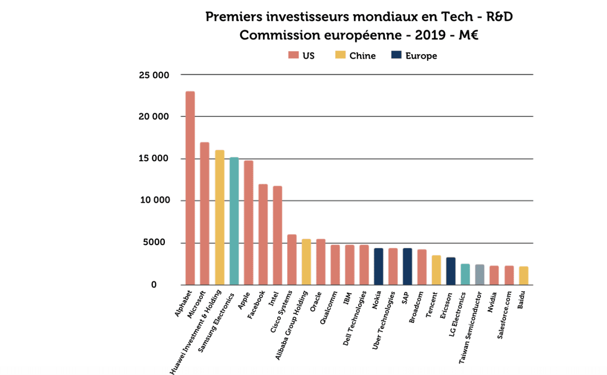 Si l’on s’intéresse maintenant aux plus grandes entreprises de la Tech, classées par investissement en R&D, la domination des acteurs américains est évidente. La présence des champions chinois est déjà impressionnante. La faible présence des industriels européens est criante. Ensuite, au sein de l’Europe, la France attire trois fois moins d’investissements que le Royaume-Uni, l’Allemagne attire deux fois moins d’investissements que le Royaume-Uni, alors que son PIB est 40 % supérieur.