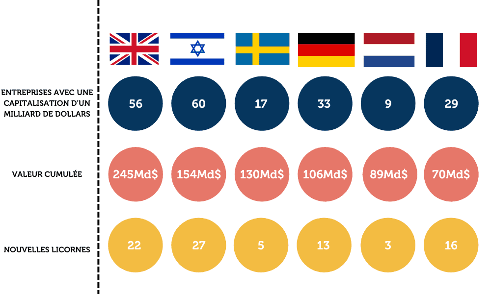 Enfin, on cite souvent les licornes comme témoins du dynamisme de la French Tech. En la matière, la France n’est que le 6ᵉ pays européen par la capitalisation boursière de ses licornes, loin derrière le Royaume-Uni et Israël (compté comme européen dans ce classement).