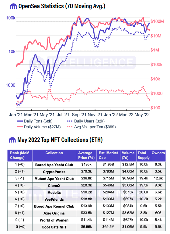 En ligne avec les performances globales du marché de la crypto, l’activité sur les marchés NFT a ralenti en mai. Les utilisateurs quotidiens et les transactions quotidiennes étaient relativement stable à -7 % et +1,1 % MoM, respectivement. Cependant, le volume NFT a vu une forte baisse avec une baisse du volume quotidien de -87,1 %. Kraken a annoncé une liste d’attente pour le marché Kraken NFT. Kraken NFT propose des frais de gaz nuls pour les activités de trading, outils intégrés pour suivre les scores de rareté des NFT. La National Football League (NFL) s’est associée à Mythical Games pour lancer son propre jeu play-to-earn qui fonctionnera sur la Mythical Chain protocole. Le lancement débutera avec la vente de 32 franchises thématiques.