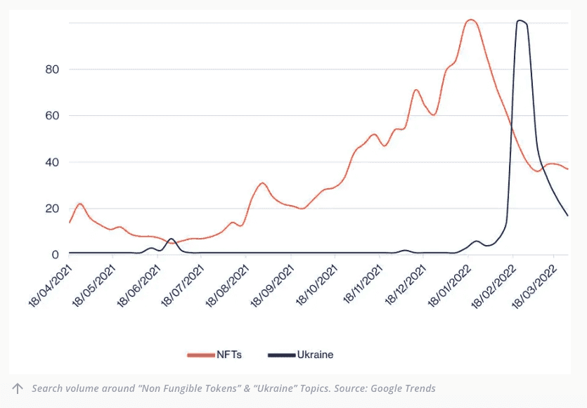 Comment le marché NFT a réagi à la guerre en Ukraine ? L’un des événements les plus marquants de ce premier trimestre est la guerre en Ukraine. C’est probablement ce qui a marqué le plus gros frein de l’industrie, comme on peut le voir sur ce tableau de recherche Google Trends. Avec la sursaturation des médias sur le sujet vers la fin de l’année, il était naturel que l’intérêt baisse. Autre facteur important, les annonces de la Fed en début d’année concernant le ralentissement des mesures financières « anti-covid ».
