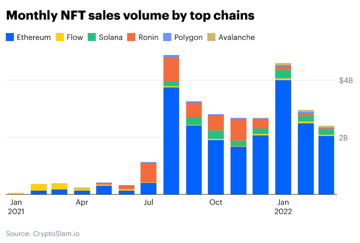 Les projets NFT visent à apporter plus d’utilité à l’espace, Yuga Labs faisant de sérieuses vagues au cours du trimestre. Alors que l’activité NFT en 2021 était centrée sur l’achat et la vente simples, la prochaine vague de projets crée de l’utilité autour des NFT. Des plates-formes comme Cymbal visent à apporter davantage de fonctionnalités communautaires et sociales autour de la propriété NFT.
