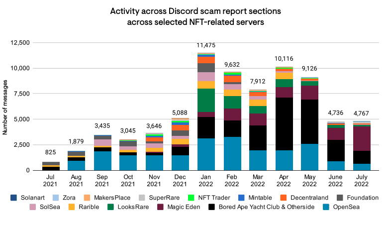 – Plus de 100 millions de dollars de NFT ont été signalés publiquement comme volés par des escroqueries entre juillet 2021 et juillet 2022, rapportant aux auteurs 300 000 $ par escroquerie en moyenne. Juillet 2022 a vu plus de 4 600 NFT volés, le mois le plus élevé jamais enregistré, indiquant que les escroqueries n’ont pas diminué malgré le marché baissier de la crypto.