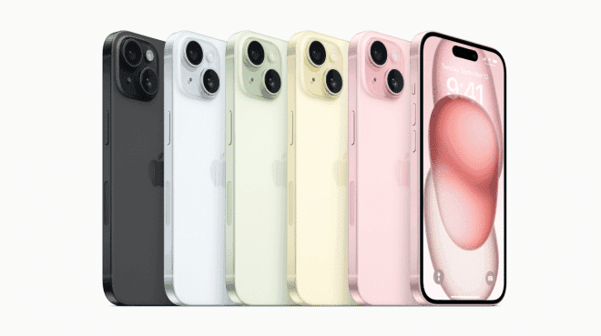 L’iPhone 15 et l’iPhone 15 Plus seront disponibles en rose, jaune, vert, bleu et noir avec 128 Go, 256 Go ou 512 Go de stockage, à partir de 969 € ) et de 1 119 €, respectivement avec une disponibilité à partir du vendredi 22 septembre.