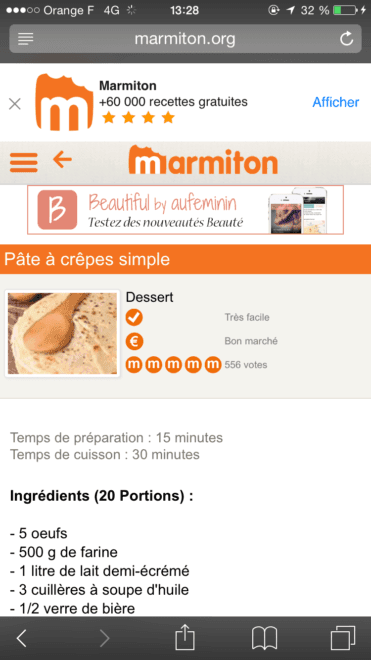 Aujourd’hui si on prend une recherche de recette sur les crêpes sur votre Smarthone, il affiche des résultats par exemple de marmiton, si vous n’avez pas l’app, il vous propose de la télécharger, parfait ! Mais une fois téléchargé si vous refaites la même recherche, il vous propose directement le site web en responsive et pas le lien profond de votre recherche dans l’app.