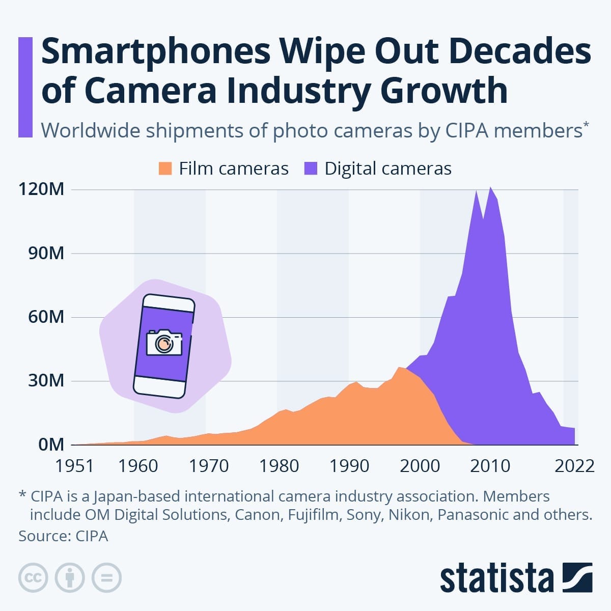 Cependant, cette tendance a eu un impact considérable sur l’industrie de la caméra traditionnelle. Comme le rapporte le CIPA, un groupe industriel basé au Japon et composé de membres tels que OM Digital Solutions (anciennement Olympus), Canon et Nikon, les expéditions mondiales d’appareils photo ont chuté de manière vertigineuse, de 93 % entre 2010 et 2022. Cette baisse spectaculaire a surtout affecté les appareils photo numériques à objectifs intégrés, jadis plébiscités par les photographes amateurs, avant la popularisation de la photographie sur smartphone. En 2022, les membres du CIPA ont livré un peu plus de deux millions de ces caméras, contre près de 109 millions en 2010, marquant la fin d’une ère de croissance soutenue dans l’industrie des caméras.