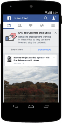 Facebook a intensifié sa campagne contre le virus Ebola en Afrique de l’Ouest avec la mise en œuvre d’une boîte de dialogue permettant aux utilisateurs de faire un don directement à partir de leur page d’accueil. La fonctionnalité permettra aux utilisateurs de faire des dons à des organismes de bienfaisance pour lutter contre la maladie actuellement. Une invitation de don apparaîtra en haut du RSS de Facebook. Le géant collabore avec l’UNICEF pour aider les utilisateurs à identifier les symptômes du virus Ebola.