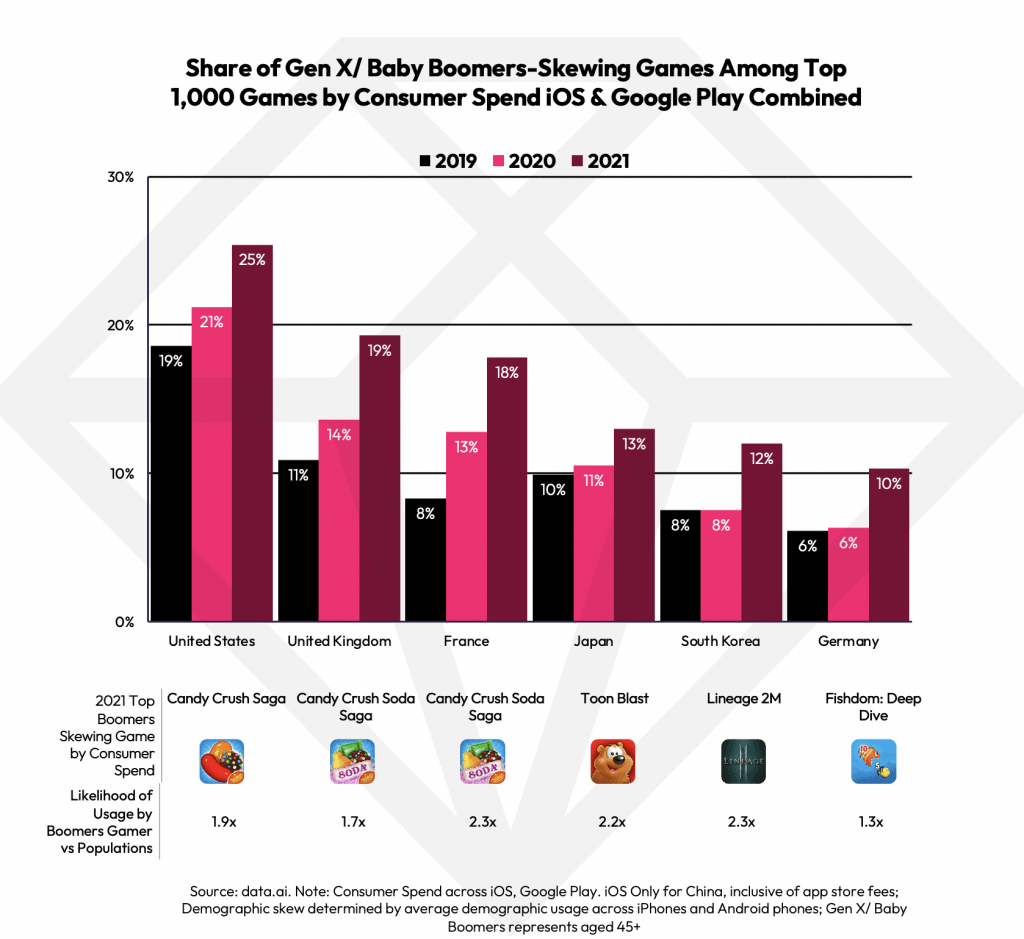 Une nouvelle étude de data.ai confirme que le marché englobe tous les groupes démographiques, tous les âges, toutes les régions et tous les genres. Les jeux mobiles devraient rapporter 136 milliards de dollars en 2022. Cela représente plus de 60 % du marché total des jeux, qui s’élève à 222 milliards de dollars. À l’ère de la console, le jeu était quelque chose que la plupart des jeunes faisaient. Plus maintenant. Le mobile a rendu le jeu accessible à tous les âges. Surtout sur les marchés occidentaux. Aux États-Unis, les jeux qui privilégient la génération X/Baby Boomers (âgés de 45 ans et plus) représentent près de 25 % des jeux les plus rentables pour 2021.