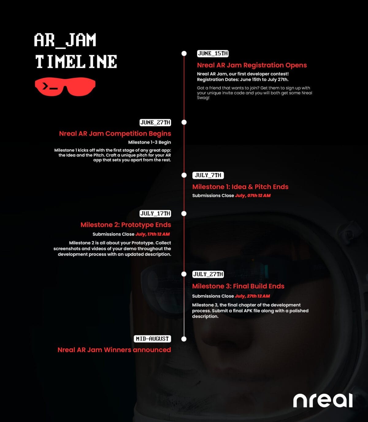 Le hackathon du 27/06 au 27/07 de Nreal va permettre de développe des applications AR pour l’OS Nebula à l’aide du NRSDK qui va montrer la créativité dans l’une des catégories suivantes, fitness à domicile, Art, gaming, casque, social, NFT, étudiant. Les bonnes applications commencent par de bonnes idées et le hackathon est l’endroit idéal !