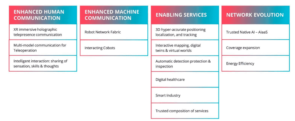 - L’évolution du réseau décrit les aspects liés à l’évolution des technologies de base, y compris l’IA en tant que service, l’efficacité énergétique et la couverture omniprésente.