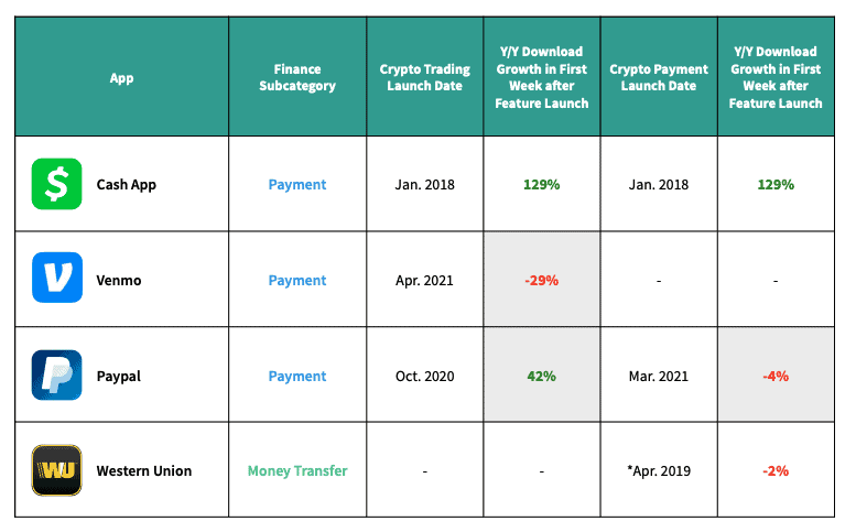 Les applications de paiement se déplacent dans l’espace de paiement crypto. Les principales applications de paiement numérique ont commencé à ajouter des fonctionnalités de trading et de paiement de crypto-monnaie, lançant l’entrée de celle-ci comme fonctionnalité grand public. PayPal a lancé sa fonctionnalité de paiement crypto en mars 2021. Cash App a été l’une des premières à autoriser le trading et paiement de crypto-monnaie dans l’application avec le lancement de ces fonctionnalités en 2018.