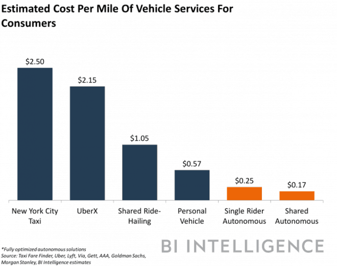 – Le coût d’exploitation par mille d’une voiture autonome utilisée dans le cadre d’un service de transport routier est seulement de 0,17 $, soit nettement moins que les 1,05 $ qu’il coûte actuellement par mile pour faire fonctionner une voiture à conduite manuelle pour une flotte de transport routier