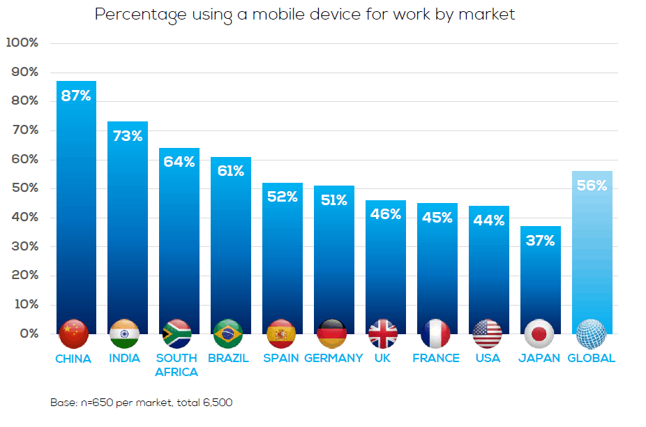 Une étude récente du MEF examinant la messagerie sur le lieu de travail a révélé que les applications de messagerie prenaient le relais comme principal moyen de communication pour le travail sur mobile, avant le courrier électronique traditionnel, et que les risques pour la confidentialité et la sécurité qui accompagnaient une telle tendance étaient une source de préoccupation parmi les employeurs. Le rapport révèle que 56% des propriétaires de smartphones dans le monde utilisent désormais leur mobile pour le travail. Les chiffres sont encore plus élevés là où les infrastructures de téléphonie fixe sont limitées, notamment la Chine (87%), l’Inde (73%), l’Afrique du Sud (64%) et le Brésil (61%).
