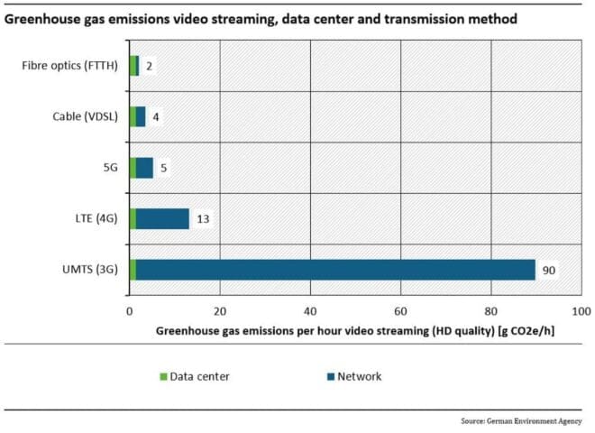 Les émissions de CO2 les plus faibles sont produites lorsque la vidéo HD est diffusée à domicile via une connexion par fibre optique, avec seulement 2 grammes de CO2 par heure de streaming vidéo pour le centre de données et la transmission de données. Un câble en cuivre (VDSL) génère 4 grammes par heure. Cependant, la transmission de données UMTS (3G) produit 90 grammes de CO2 par heure. Si la technologie de transmission utilisée pour transmettre les données est la 5G, seuls environ 5 grammes de CO2 sont émis par heure. L’électricité utilisée par le terminal n’est pas prise en compte dans ce calcul.