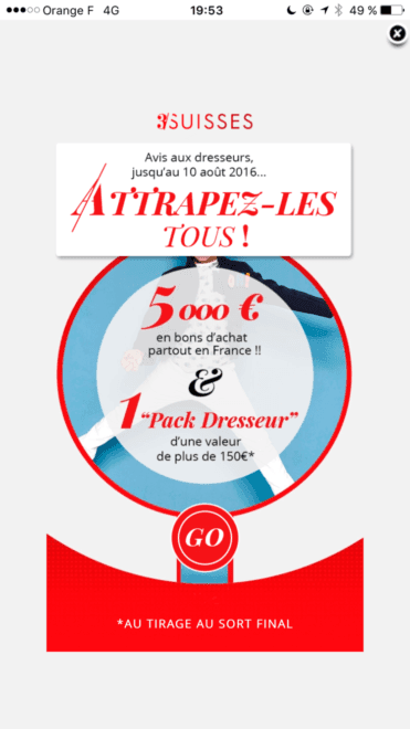 Avec sa stratégie mcommerce et à l’occasion du lancement de Pokémon Go en France, 3Suisses active une opération événementielle et propose son jeu « Attrapez-Les Tous ! » Jeu disponible uniquement via l’application smartphone m-commerce.
