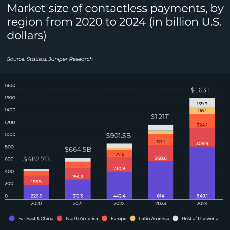 La Chine et l’Extrême-Orient sont la première région pour ce type de transactions, générant plus de la moitié de tous les paiements sans contact dans le monde. En 2021, les pays de la région devraient générer 313,3 milliards de dollars de transactions, soit 38 % de plus qu’il y a un an. D’ici 2024, ce chiffre devrait augmenter de 170 % et atteindre une valeur de 850 milliards de dollars.