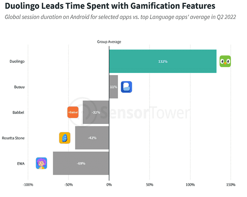 Au deuxième trimestre 2022, Duolingo avait la durée de session la plus élevée parmi une cohorte des meilleures applications linguistiques mondiales, notamment Busuu, Babbel et Rosetta Stone. Une partie de l’avance de Duolingo en termes de temps passé peut être attribuée à sa stratégie de gamification : l’application maintient les utilisateurs mobiles engagés avec un éventail de fonctionnalités, y compris des notifications d’encouragement quotidiennes, la possibilité de gagner des points d’expérience pour les leçons terminées et l’utilisation de gemmes, une forme de monnaie.