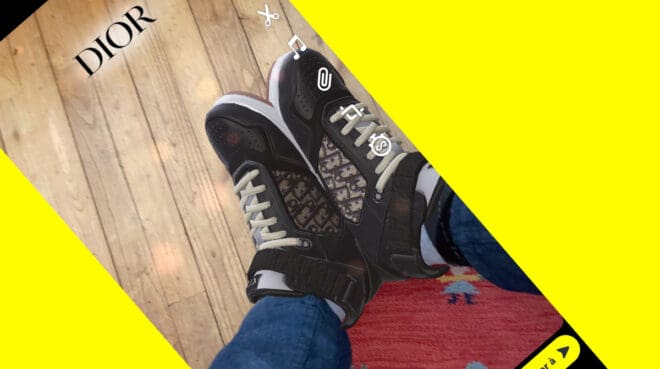 Ci-dessous, une campagne sur Snapchat de Dior qui permettait d’essayer une série de baskets de la marque et de les acheter. L’intégration présente six styles différents de la sneaker B27, qui se vendent entre 990 $ et 1 100 $. Les utilisateurs peuvent essayer les baskets en AR et, s’ils aiment ce qu’ils voient, la chaussure peut être achetée directement dans Snapchat. L’expérience ne sert pas seulement à remplacer l’expérience d’essayage en magasin, mais rend la chaussure Dior plus accessible aux clients qui, autrement, ne pourraient pas trouver la B27 dans les magasins à proximité.